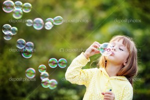 Portrait of funny lovely little girl blowing soap bubbles